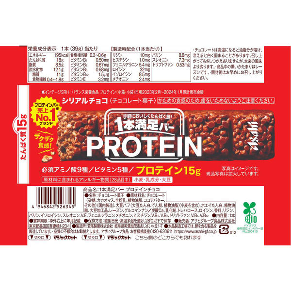 素材 | 【原材料】 チョコレート(砂糖、カカオマス、全粉乳、植物油脂、ココアバター、その他)(国内製造)、大豆パフ(大豆たん白、でん粉、植物油脂)(小麦を含む)、ホエイたん白、植物油脂、大豆加工品、レーズン、グルコマンナン/炭酸Ca、乳化剤、トレハロース、ロイシン、香料、リジン、バリン、イソロイシン、スレオニン、V.E、フェニルアラニン、メチオニン、ヒスチジン、V.B6、V.B2、トリプトファン、V.B1、V.B12 【栄養成分表示】 エネルギー:195kcal、たんぱく質:18g、脂質:8.5g、炭水化物:12.1g、―糖質:11g、―食物繊維:0.4~1.8g、食塩相当量:0.3~0.6g、ビタミンB1:0.50mg、ビタミンB2:0.67mg、ビタミンB6:0.58mg、ビタミンB12:1.5μg、ビタミンE:3.2mg、リジン:10mg、ヒスチジン:1.0mg、フェニルアラニン:5.4mg、ロイシン:32mg、イソロイシン:8.5mg、メチオニン:2.4mg、バリン:8.8mg、スレオニン:7.3mg、トリプトファン:0.53mg |