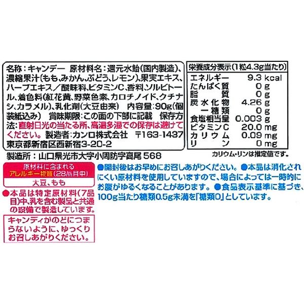 素材 | 【原材料】 還元水飴(国内製造)、濃縮果汁(もも、みかん、ぶどう、レモン)、果実エキス、ハーブエキス/酸味料、ビタミンC、香料、ソルビトール、着色料(紅花黄、野菜色素、カロチノイド、クチナシ、カラメル)、乳化剤(大豆由来)または還元水飴(国内製造)、果実エキス、ハーブエキス/酸味料、ビタミンC、ソルビトール、香料、着色料(紅花黄、野菜色素、カロチノイド、クチナシ、カラメル)、乳化剤(大豆由来) 【栄養成分表示】 (1粒4.3g当たり) 熱量(kcal)9.3Kcal・タンパク質0g・脂質0g・炭水化物4.26g・一糖類0g・食塩相当量0.003g・ビタミンC20.0mg・カリウム0.09mg・リン0mgまたは(1粒4.3g当たり)・熱量(kcal)9.3Kcal・タンパク質0g・脂質0g・炭水化物4.25g・-糖質4.25g・一糖類0g・食物繊維0g・食塩相当量0.003g・ビタミンC20.0mg |