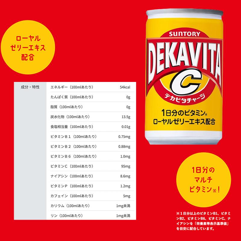 商品詳細 | 強炭酸と7種のビタミンが、カラダにみなぎる! もうひと頑張りしたい時に、頼りになるエナジードリンク。 疲れを吹き飛ばす、爽快な一口。 ローヤルゼリーエキスとビタミンで、元気とリフレッシュを手軽にチャージできます。 デカビタCでいつもの時間をもっとパワフルにし、あなたの毎日を応援します! |